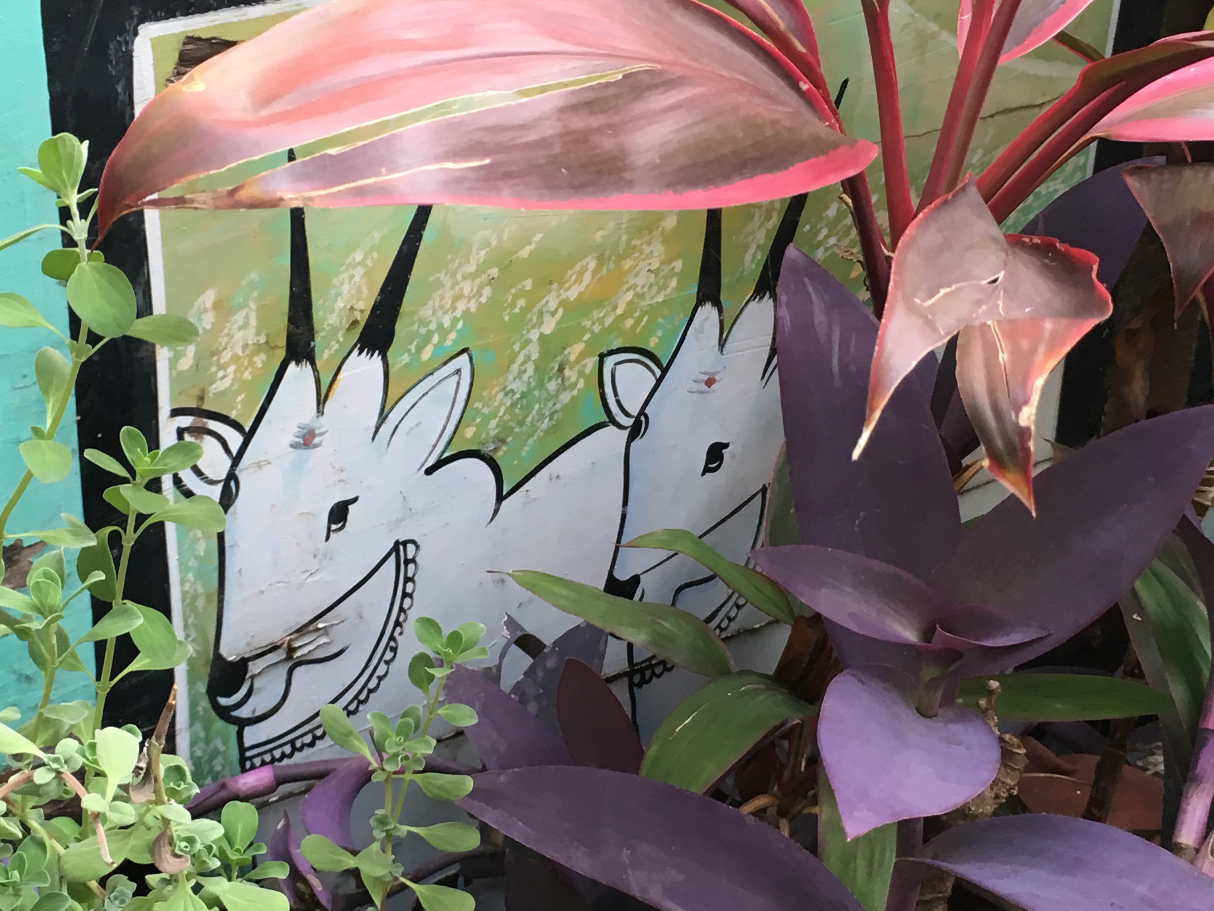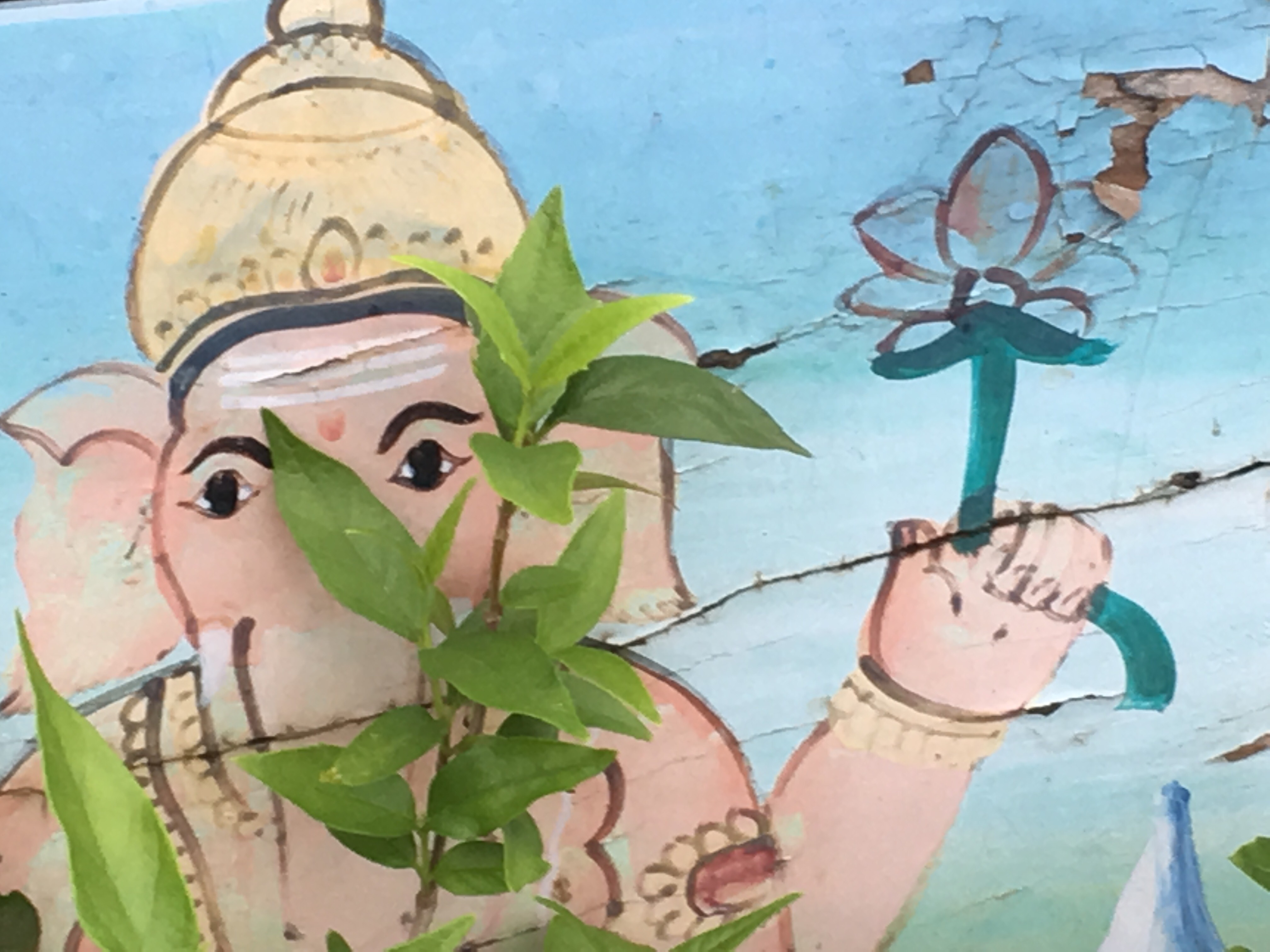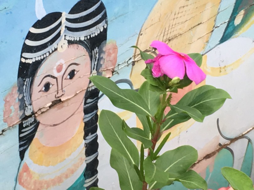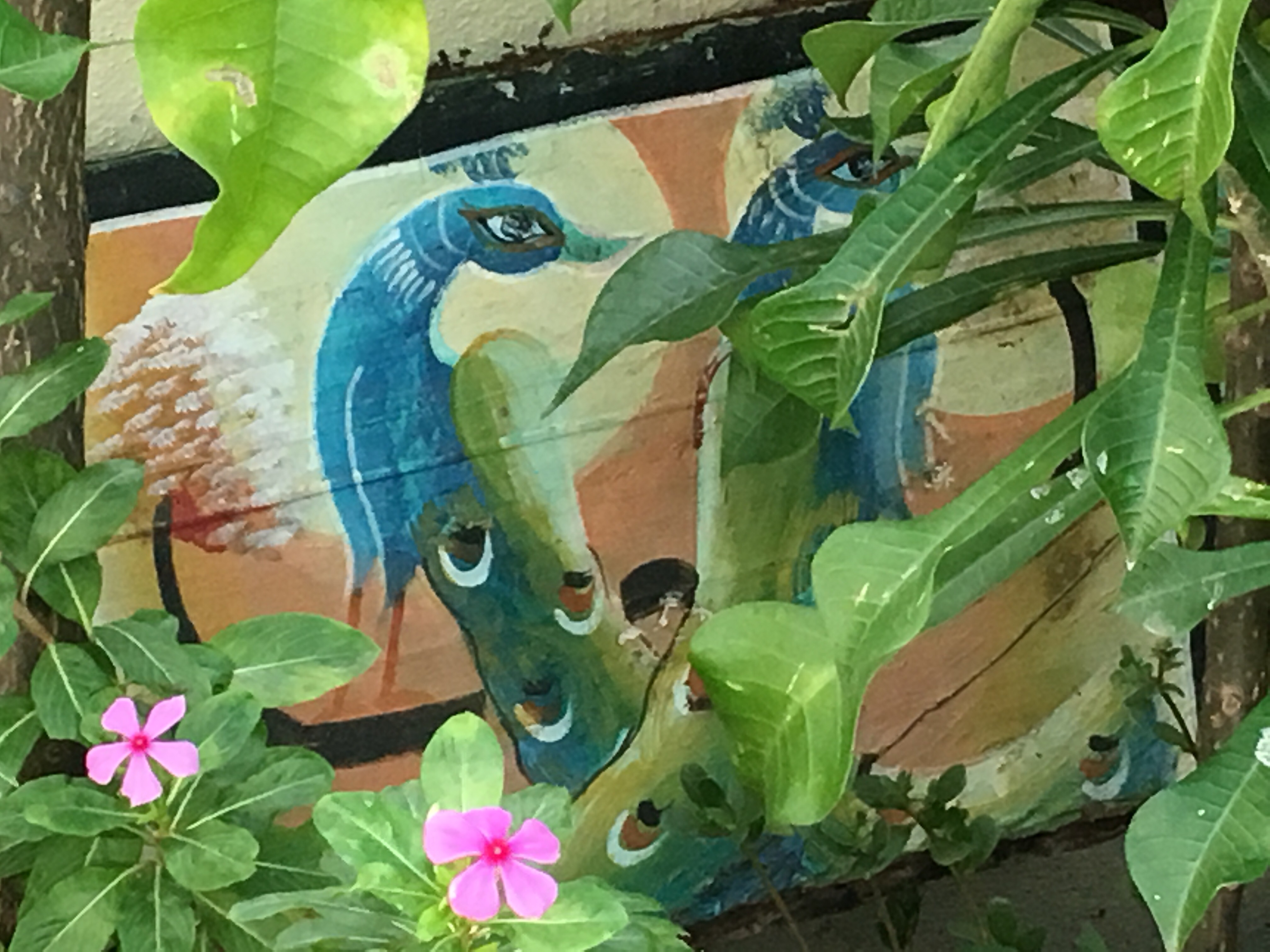 We have beautiful art both natural flora and fauna on our roof terrace and peeking through are images from the painted sides of bullock carts.