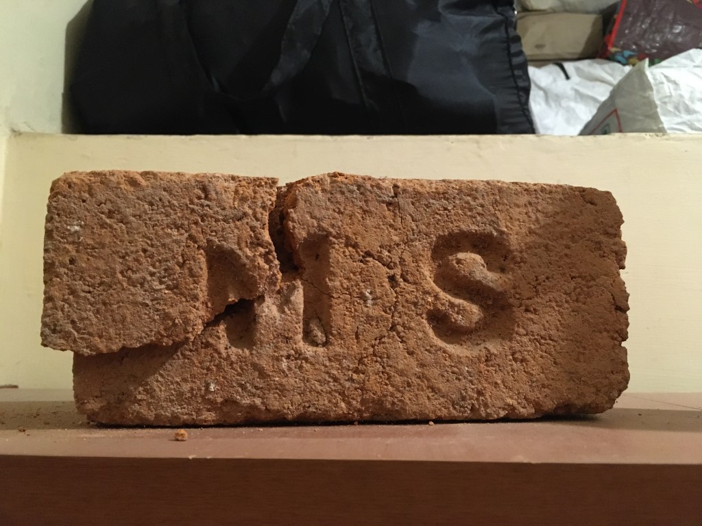 Today a brick fell off the wall. This thick one knocked it onto the ground and it broke.