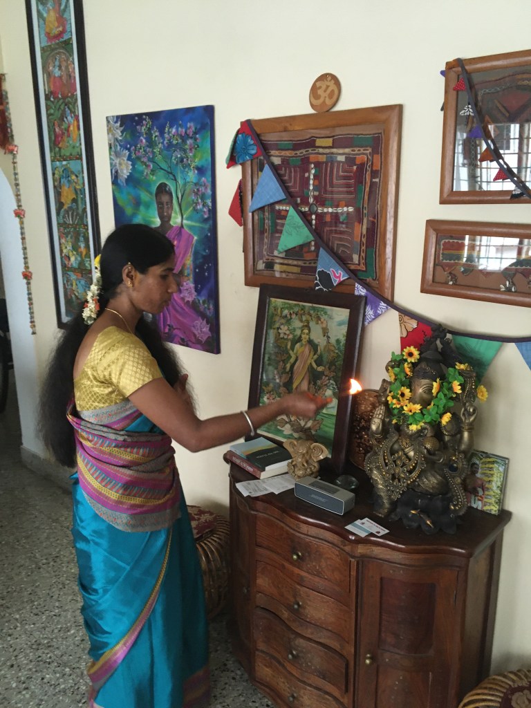 Sowbhagya prepares the house, the Pooja room And finally all the Gods and Goddesses including MAnjula get a turn with a agarbati and flaming camphorLucie is sad, as she probably misses MAnjula doing the puja rituals.