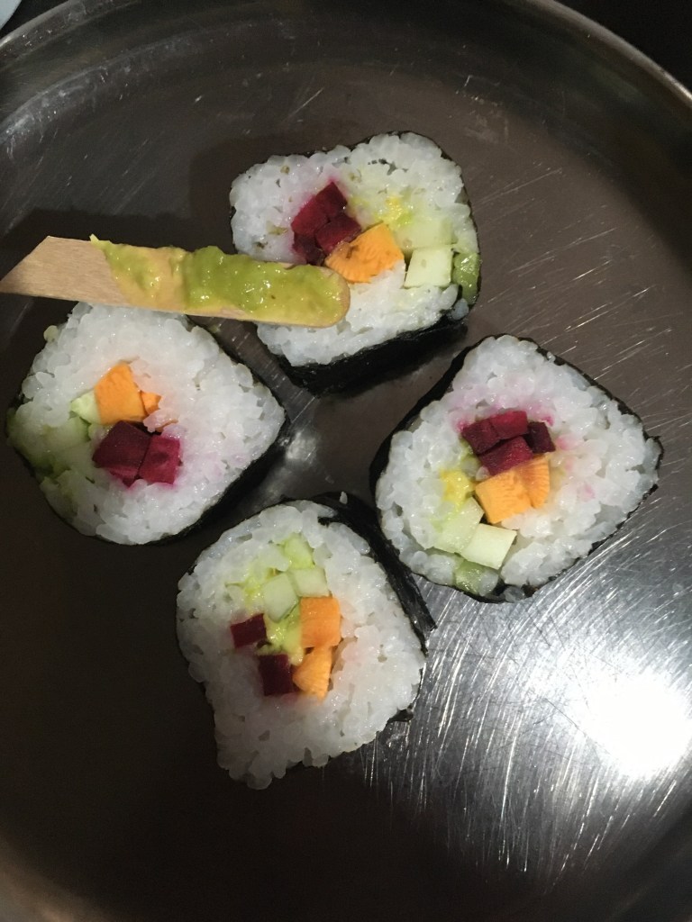 A lovely family round the corner kindly donated some plants for Manjula’s garden. Lucie didn’t want to leave. Sushi surprise from Sahana’s kitchen
