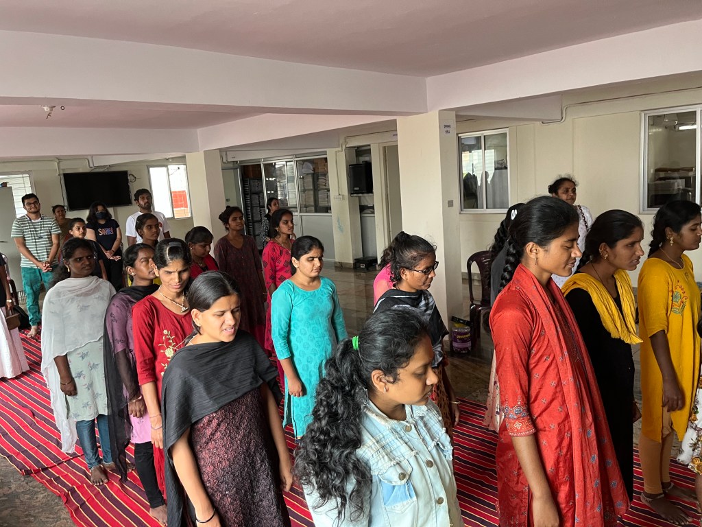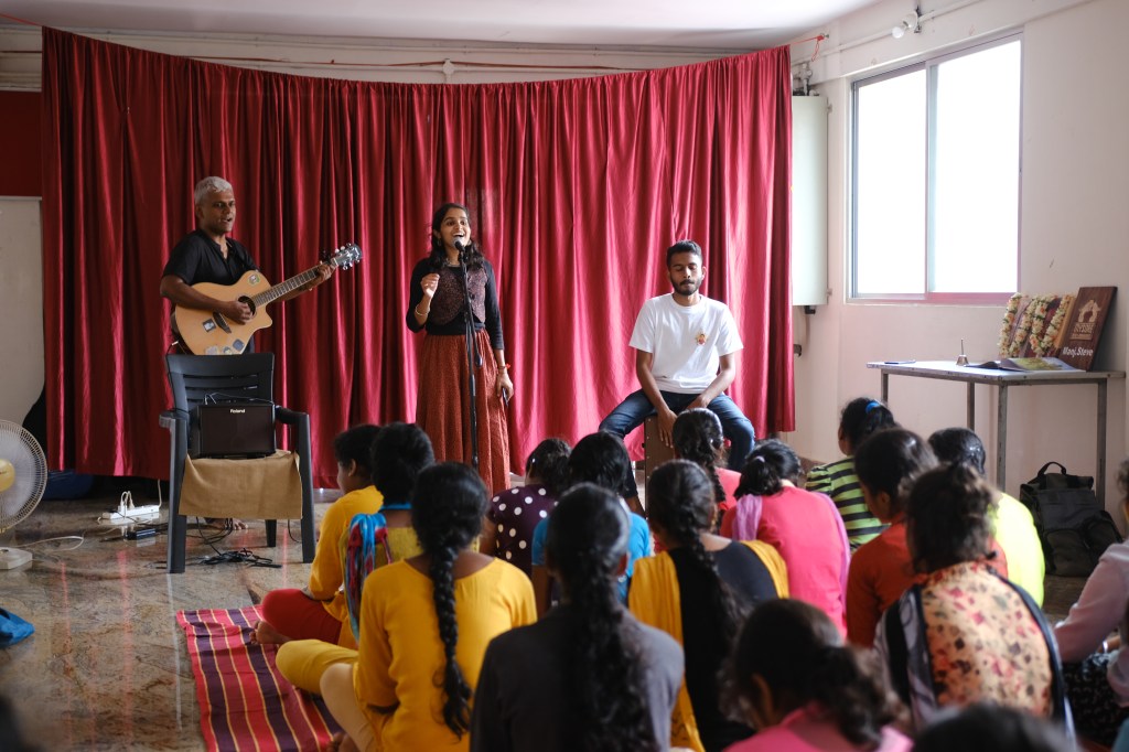 The young women especially liked the game ‘What’s in the box’ identifying objects through touch and smell, organised by Gauri Nadig. Then we all shared songs with Poornima singing and Vishnu Sharma playing guitar, Sridevi teaching songs, accompanied by Sarvesh on his Cajon clap box