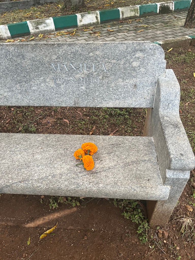 Gathered today on Manjula’s bench, next to Manjula’s garden, eating Manjula’s radiantness cake and celebrating her wonderfulness on her 51st birthday celebrations that have already gone on for a week. we have Kaveri, Radhika, Maria, John, Ina, Lucie and Stephen.