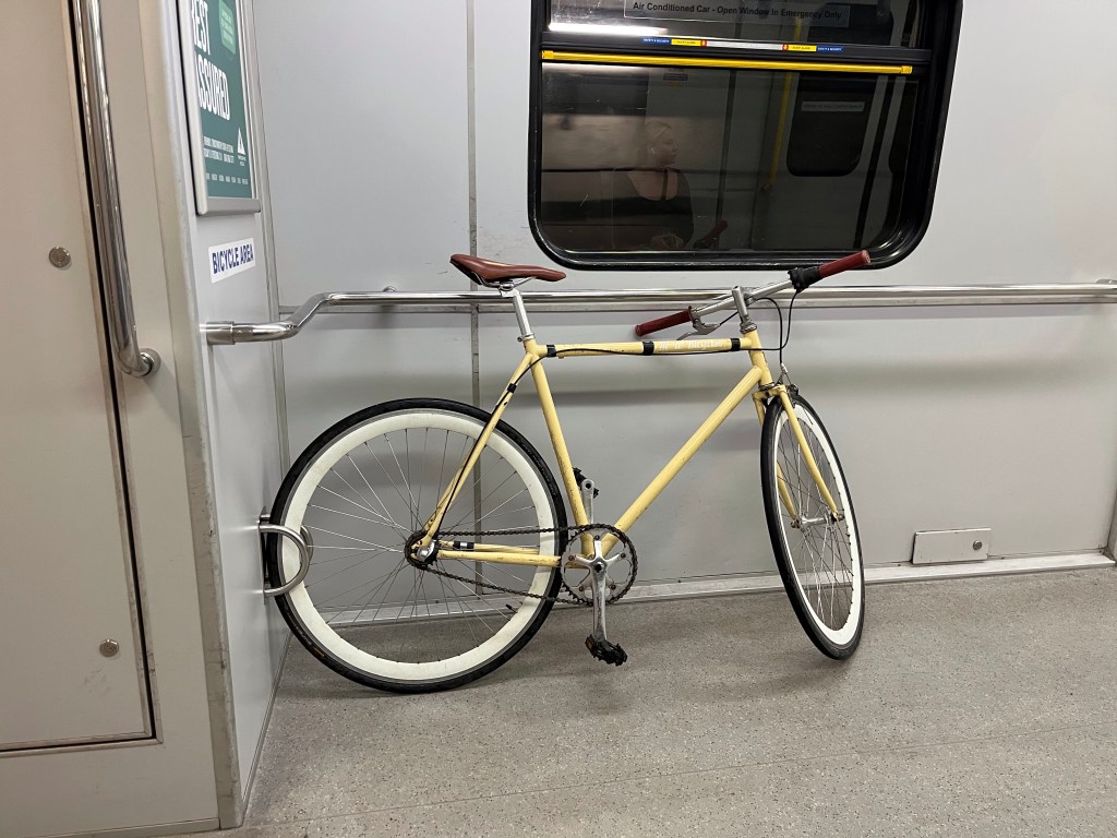 She’s distinctive with her yellow frame, white wheels and pretend leather saddle. She has a single front rim brake.
