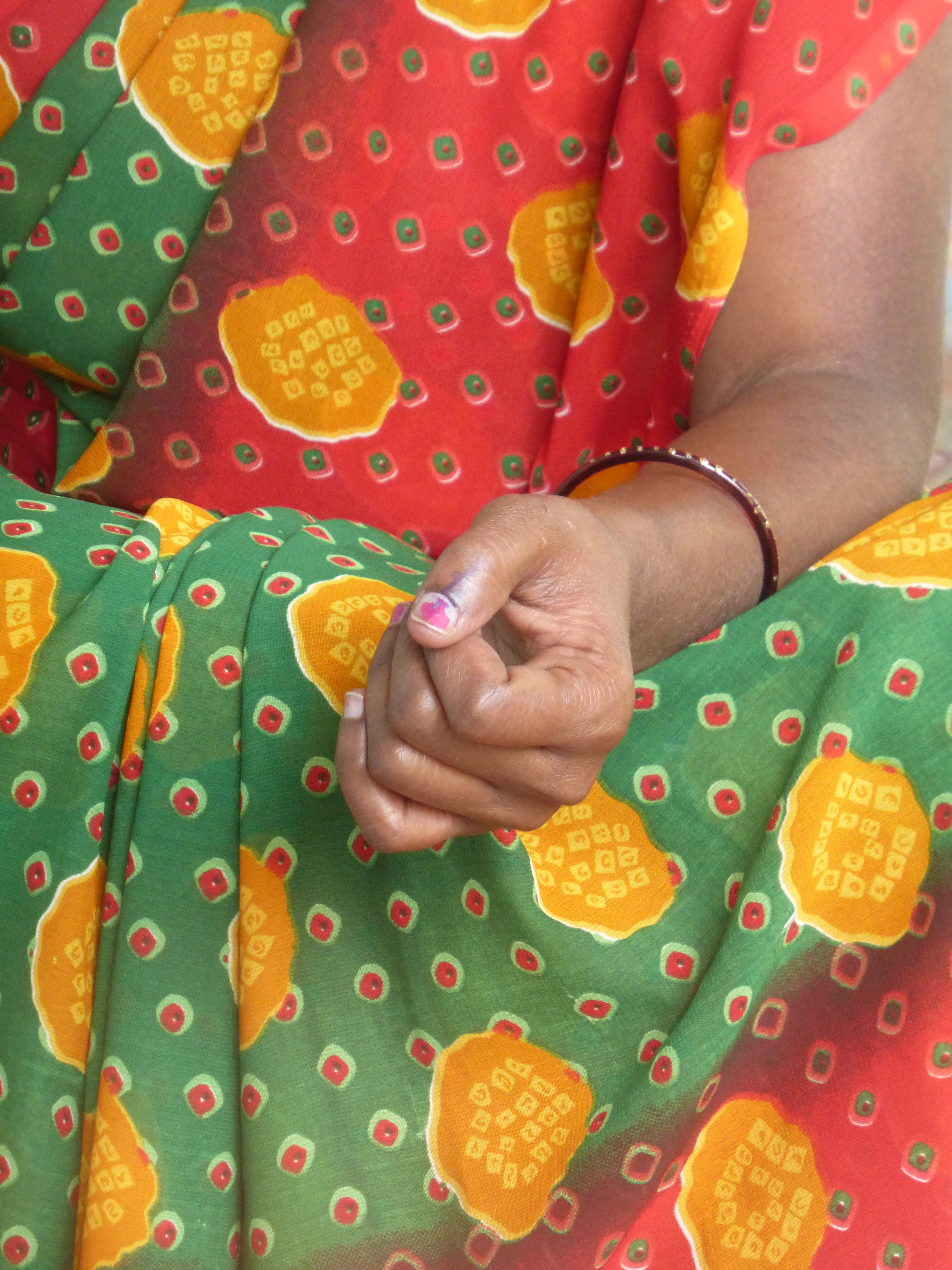 Check the photo of Manj. Here’s the mark of the indelible ink on her thumb to prove she’s voted and can’t therefore vote a second time.