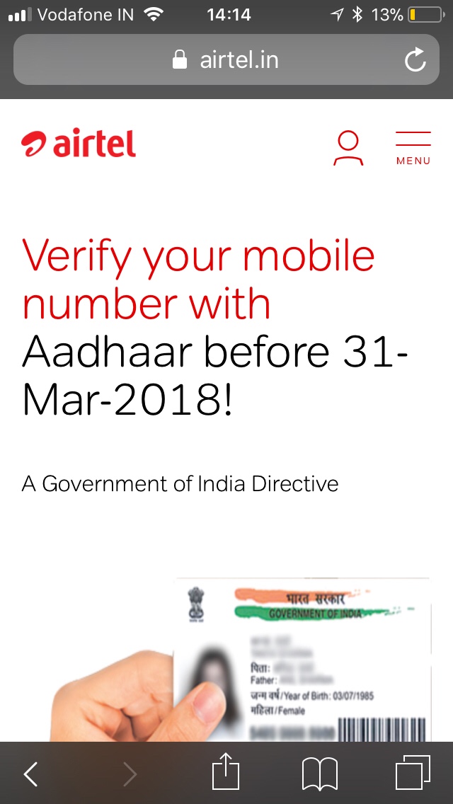 the Indian Government insists that your national ID card, known as the Aadhaar Card be associated with your mobile number for you to have continued service. As below. (I’m not commenting here about ‘Big Brother’ and will leave that for another time. )