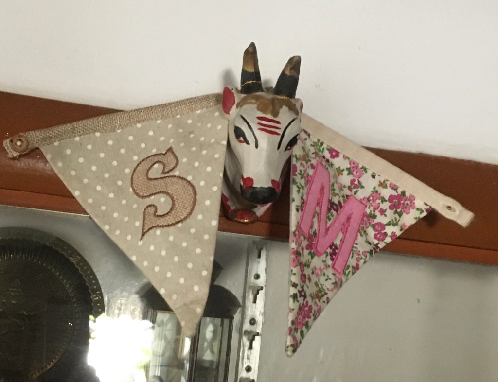 A few weeks ago, I complained to Manjula that I’d not heard from her. Within days a dragonfly maybe ten times bigger flew into the downstairs hall, circled me three times and landed on Manjula’s pennant.