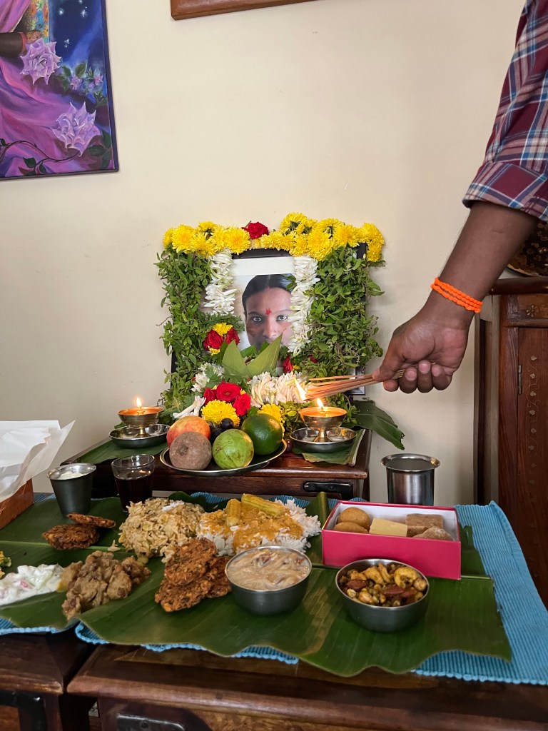 In memory of MAnjula as with many households a photo, is placed in the hall (lounge/living room) when people die. For the first year we’d place flowers around her every month, with a special Pooja on her annual death anniversary. This all part of a series of rituals to help her soul spirit find another body and be reincarnated into her next life.