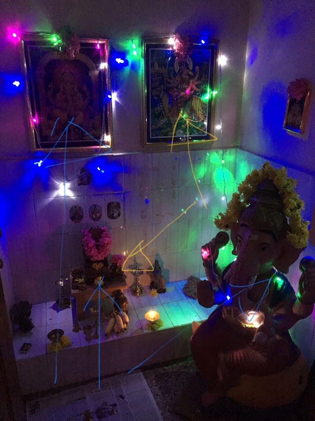 Blue for Ganesh. Yellow for Chamundeshwari. Other partygoers: Krishna and Shiva.
