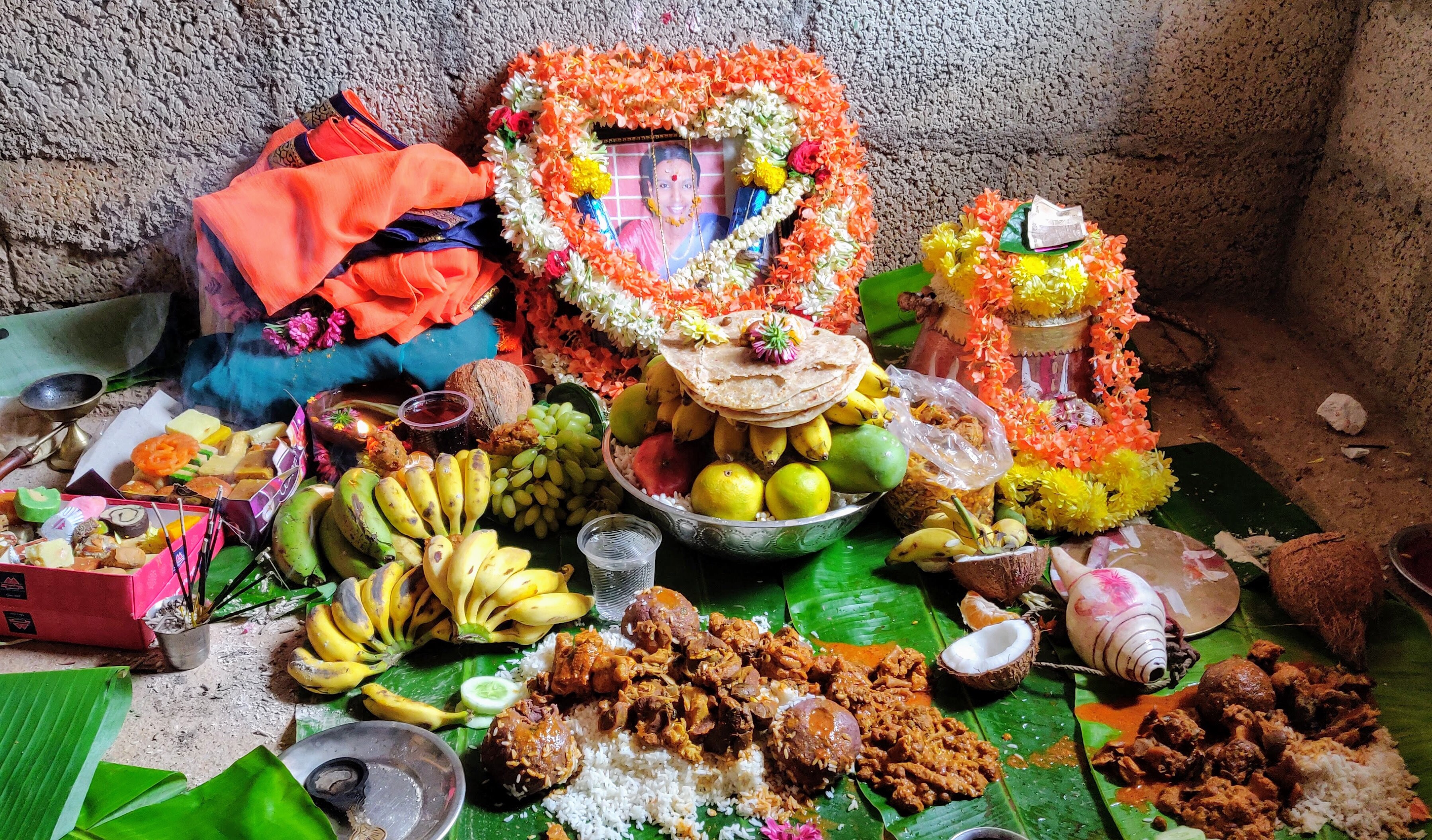 Manjula’s photo was the centrepiece she was garlanded and then surrounded by offerings. Of things she liked, maybe.