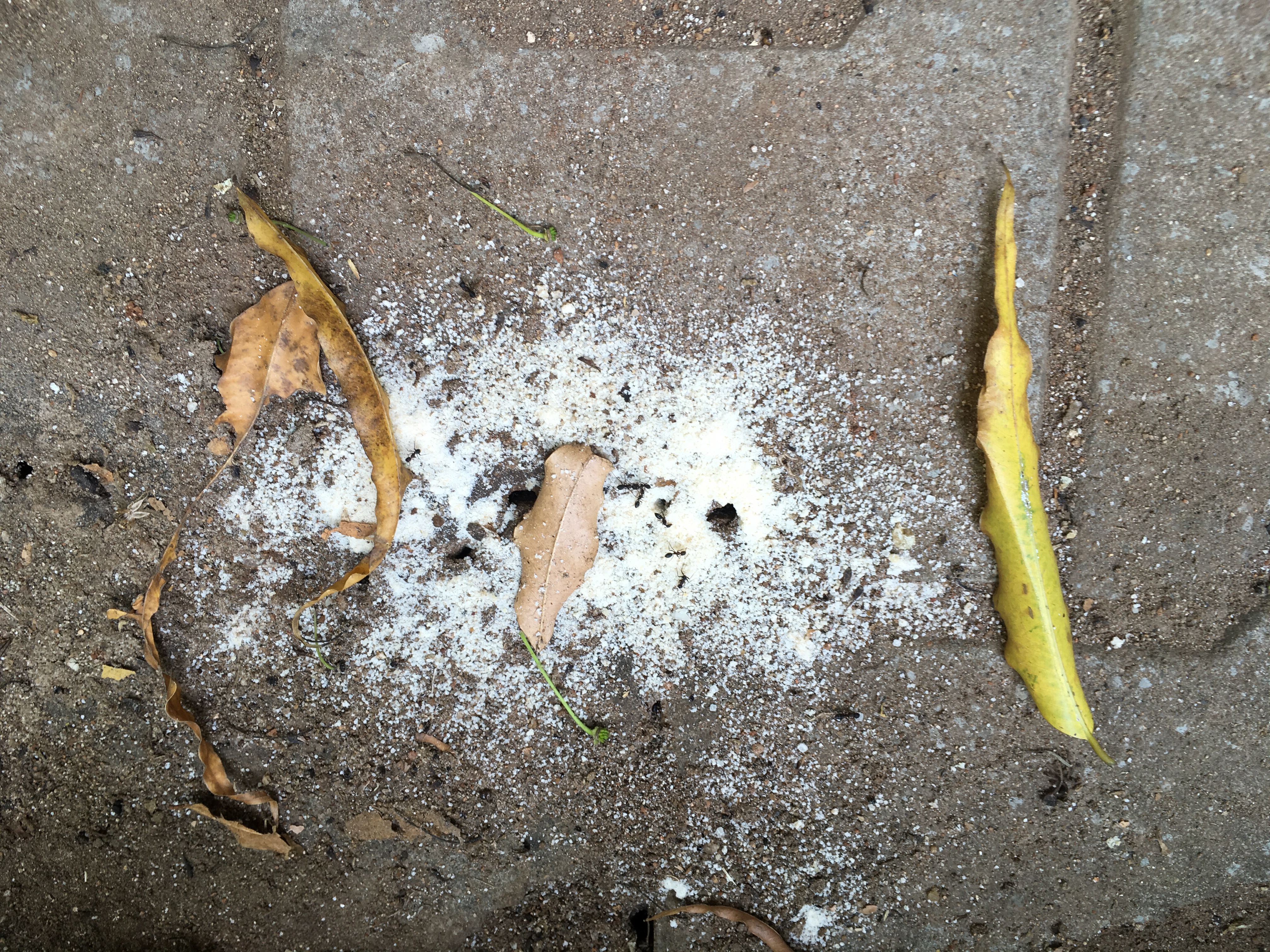 Piles of powder on the ground Crunchy stuff on top of the walls.