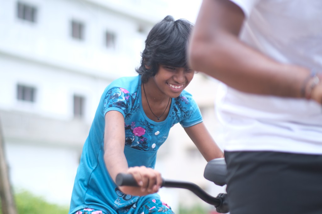 Volunteer Sowbaghya giving an extra helping hand and getting feedback after their rides.