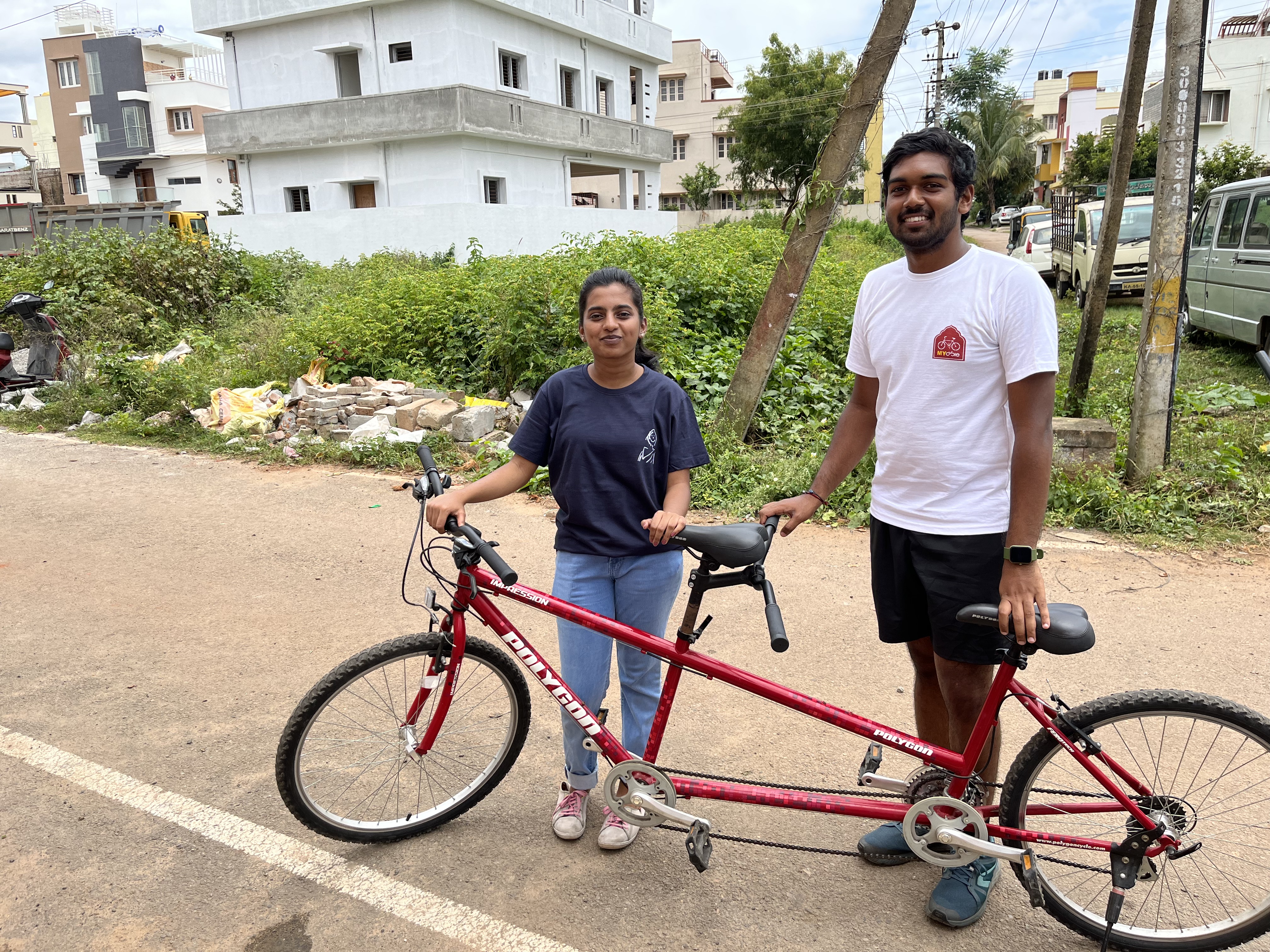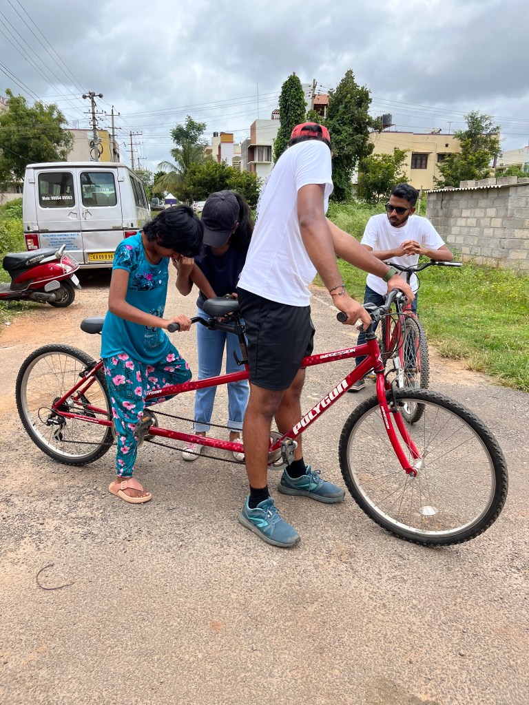 On the ‘Manjula’s Gift fun day’ organised by Manjula’s Mysore and its partners, three young volunteers: Tusharr, Megha and Sarvesh from MYCycle Tours were there to guide. They provided clear instructions: explained how to get on, feel the saddle, hold the handlebars, step over the frame, find the pedals and sit comfortably. A sighted person on the front steered, set the pace and kept the balance. Another volunteer cycled along and explained what was happening.